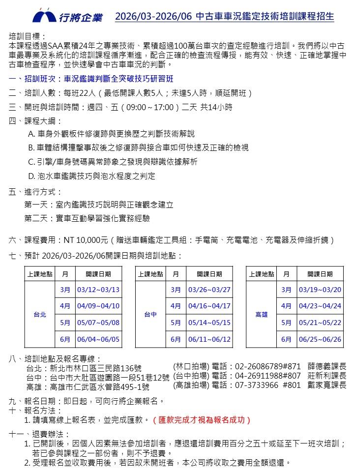 NEW!!2026/03-2026/06中古車車況鑑定技術培訓課程招生簡章