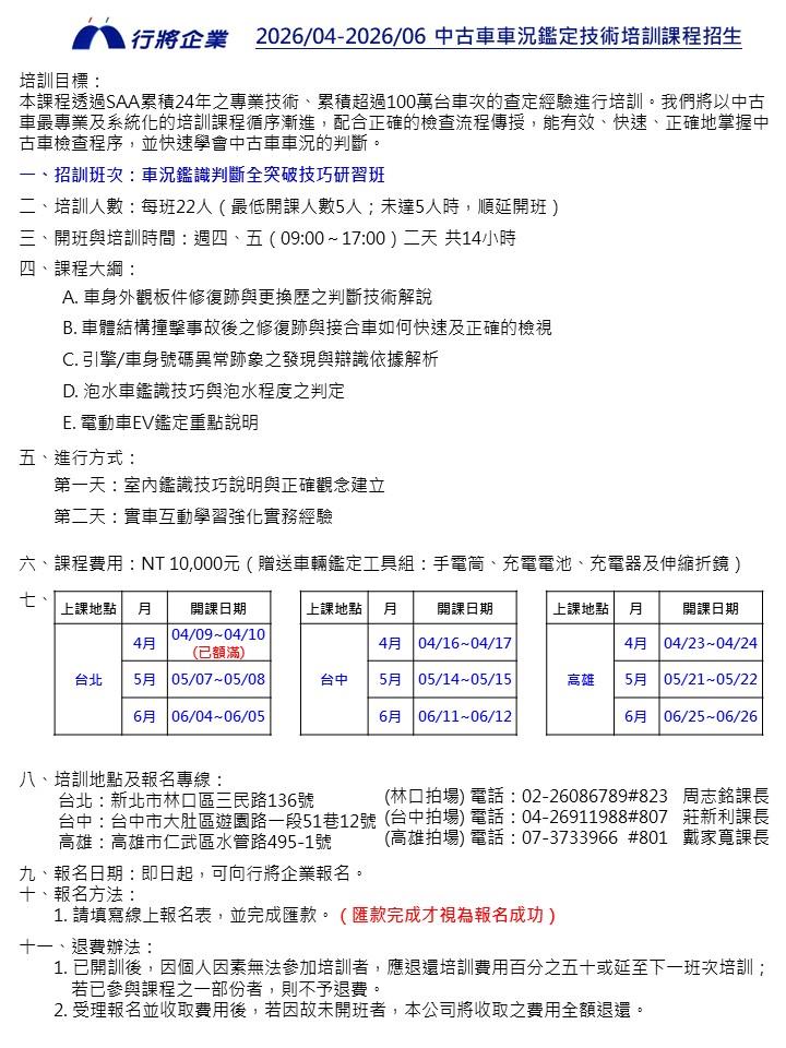 NEW!!2026/04-2026/06中古車車況鑑定技術培訓課程招生簡章